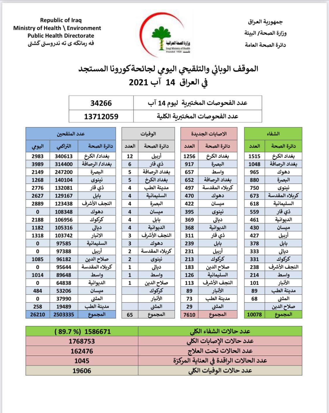 أعلنت وزارة الصحة، اليوم السبت، الموقف الوبائي اليومي لجائحة كورونا في عموم العراق.