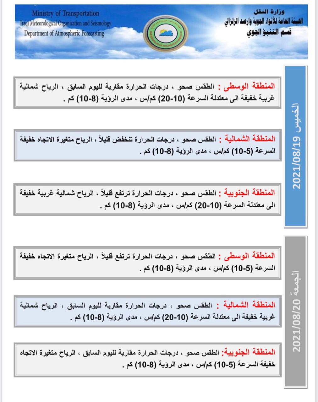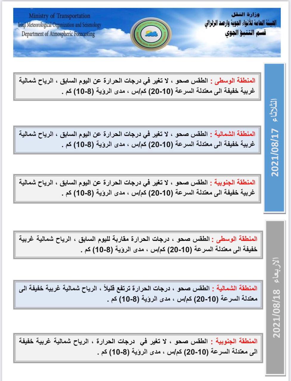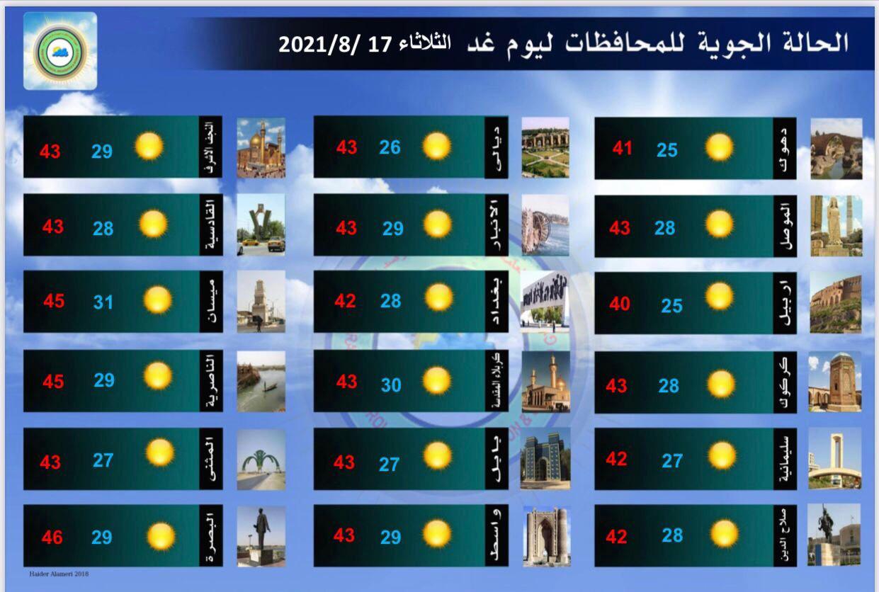 أعلنت هيئة الأنواء الجوية، اليوم الاثنين، عن حالة الطقس في البلاد خلال الأيام المقبلة، فيما توقعت ارتفاع في درجات الحرارة ابتداءً من الاربعاء المقبل.