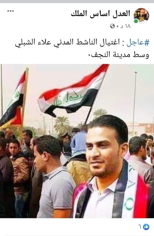 نفت مديرية شرطة النجف، اليوم الاحد، اغتيال الناشط المدني علاء الشبلي، مشيرةً الى انه توفي إثر حادث سير مروري.