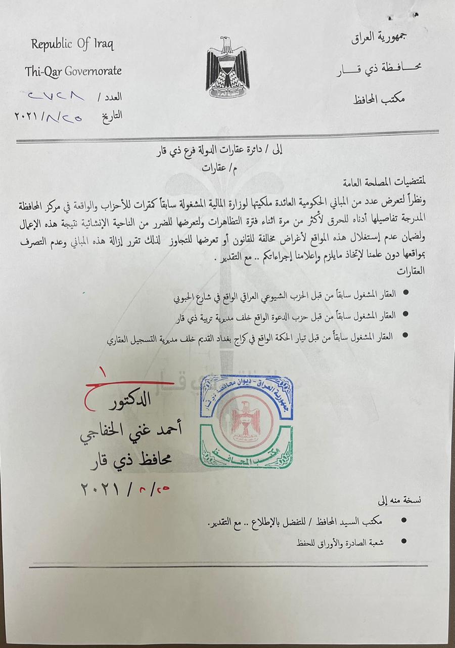 بالوثيقة .. محافظ ذي قار يوجه بإزالة ثلاثة مبانٍ كانت مشغولة من قبل أحزاب سياسية