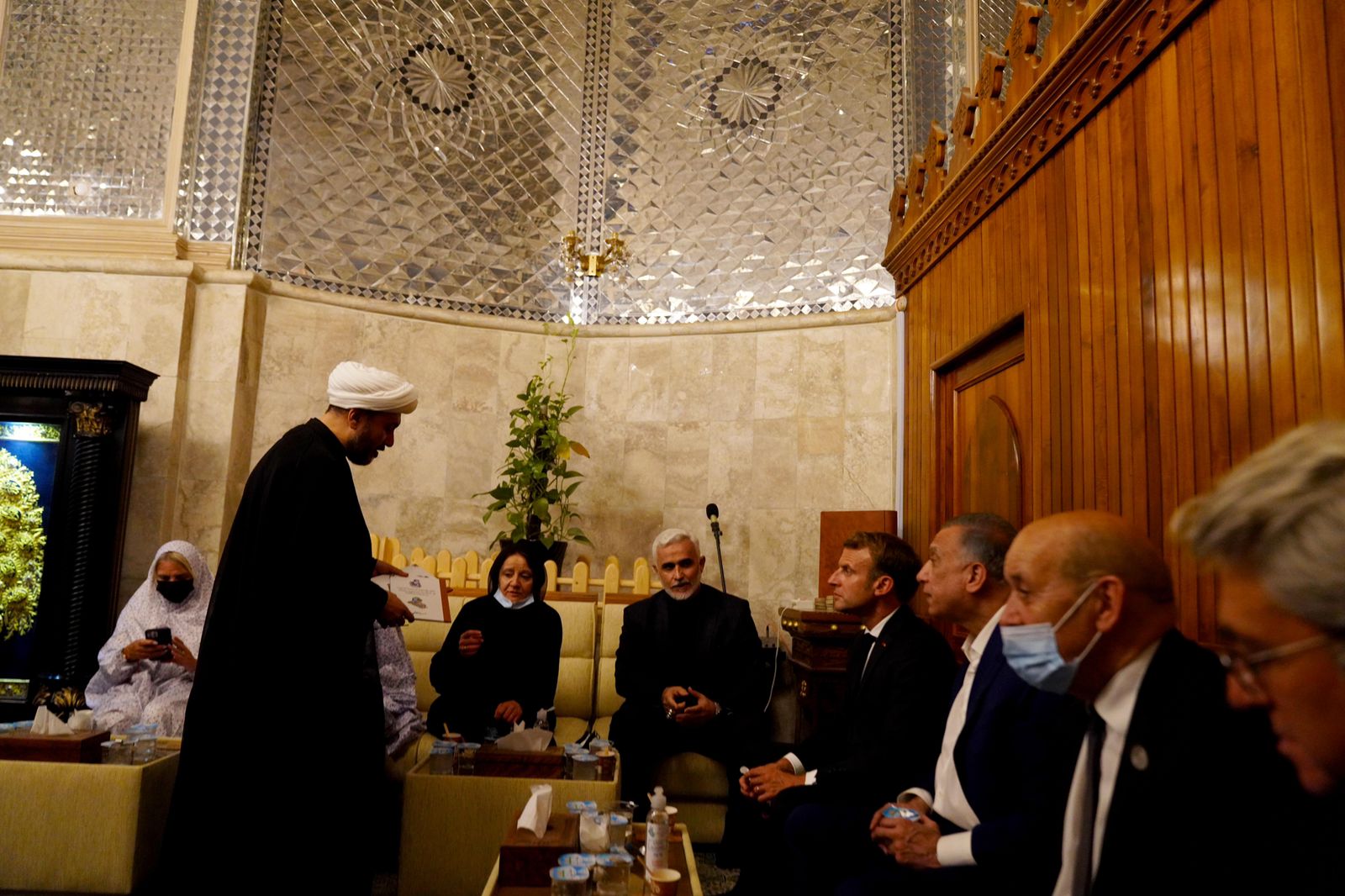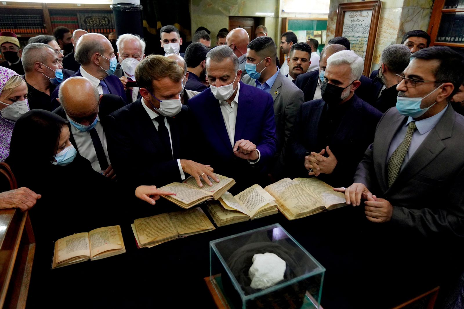 والتقى رئيس مجلس الوزراء والرئيس الفرنسي بالقائمين على العتبة الكاظمية المقدسة، فضلاً عن إجراء جولة في مكتبة العتبة.