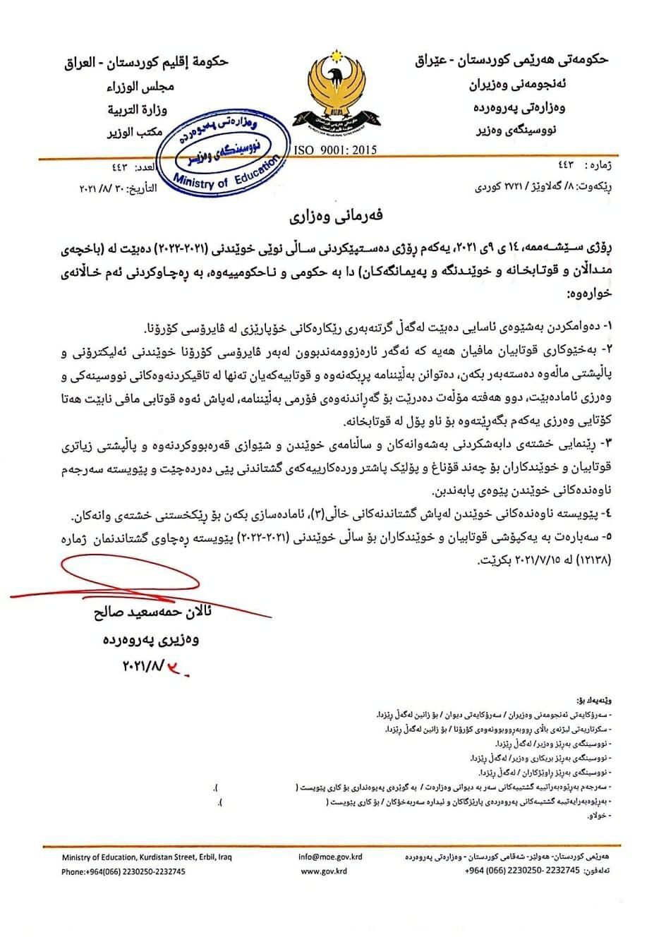 قررت وزارة التربية في إقليم كردستان، اليوم الأربعاء، جعل دوام المدارس الذي سينطلق في 14 أيلول الجاري حضورياً.