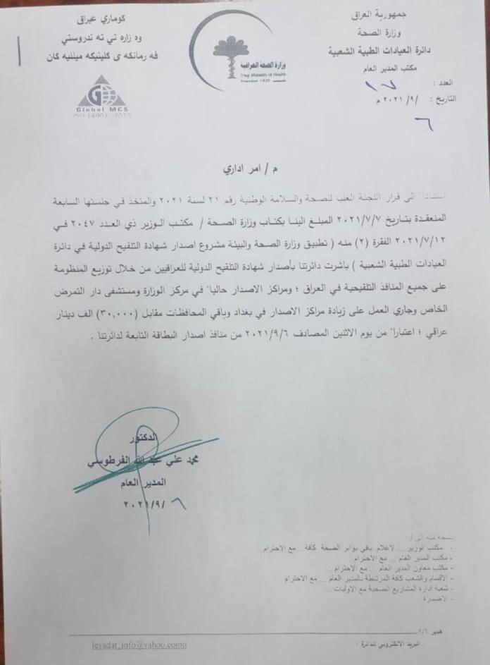 محلياتبالوثيقة .. إصدار شهادة التلقيح الدولية للعراقيين قبل 4 سنوات 5 مشاهدات شارك الوسومشهادة التلقيح الدولية للعراقيينقد يهمك أيضا عربي ودولي وزير الخارجية الامريكي: نعزز وجودنا العسكري في الشرق الأوسط لمنع إيران من مهاجمة قواتنا قبل 25 دقيقة 7 مشاهدات محليات العدل تشكل لجنة تحقيقية حول مقطع فيديو متداول لنزلاء سجن العمارة المركزي قبل 45 دقيقة 12 مشاهدات سياسة الفياض يؤكد للسفير التركي رفض أي تدخل خارجي في الشؤون العراقية قبل ساعة واحدة 9 مشاهدات عربي ودولي بدعوى تهديد السلم والامن الدوليين.. كندا تفرض عقوبات إضافية على إيران قبل ساعة واحدة 8 مشاهدات الاخبار العاجلة وزير الخارجية يدعو النمسا إلى إعادة فتح خطِّ الطيران المباشر بين بغداد وفيينا قبل ساعتين 8 مشاهدات