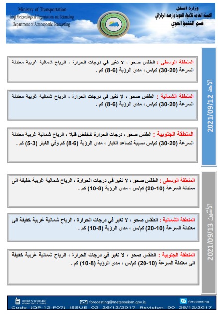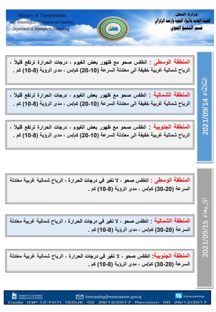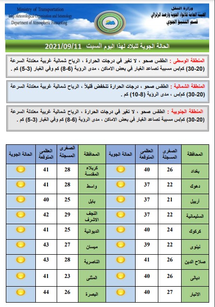 نشرت هيئة الانواء الجوية، تقريرها الخاص بالطقس في العراق خلال الايام المقبلة.