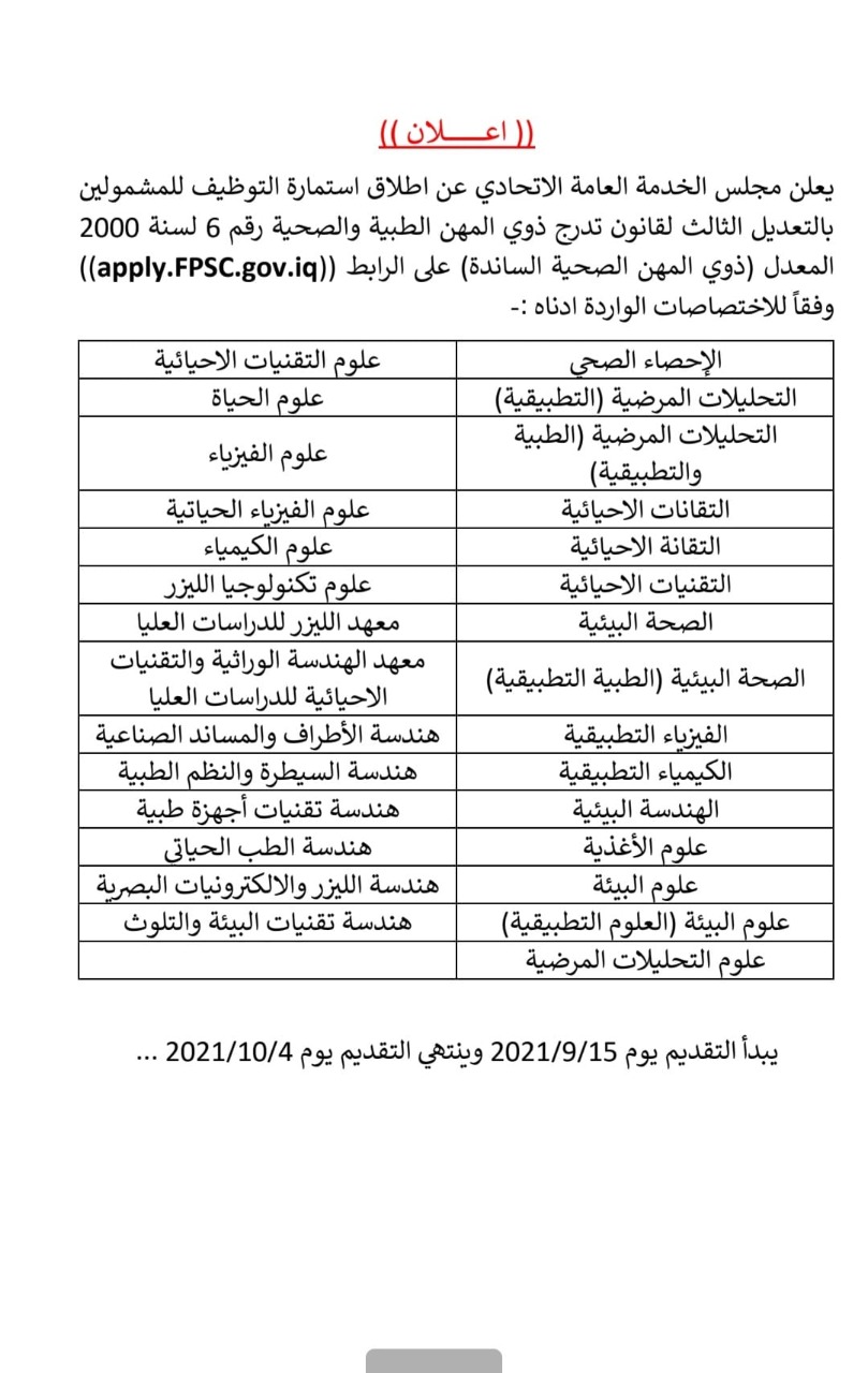 اعلن مجلس الخدمة العامة الاتحادي، اطلاق استمارة التوظيف للمشمولين بالتعديل الثالث لقانون تدرج ذوي المهن الطبية والصحية رقم ٦ لسنة ٢٠٠٠ المعدل ( ذوي المهن الصحية الساندة).