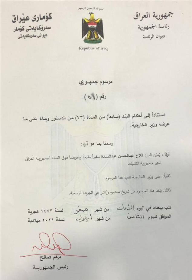 سياسةبالوثيقة.. تعيين فلاح عبدالحسن سفيرا للعراق في التشيك قبل 4 سنوات 9 مشاهدات شارك اصدر رئيس الجمهورية برهم صالح، امرا بتعيين فلاح عبدالحسن سفيرا للعراق في التشيك. الوسومالتشيكالعراققد يهمك أيضا محليات العثور على جثة متفحمة تعود الى احد العاملين جراء الحريق داخل مصفى بيجي قبل 59 ثانية 2 مشاهدات أمن الاعلام الامني: 6 مصابين بحريق في وحدة تحسين البنزين داخل مصفى بيجي قبل 5 دقائق 2 مشاهدات الثامنة قواعد الإطار تتفكك قبل 23 دقيقة 6 مشاهدات رياضة الموت يفجع محمد صلاح قبل ساعتين 19 مشاهدات محليات المفوضية: غداً إطلاق مكافآت موظفي الاقتراع في محافظات البصرة ودهوك وميسان قبل ساعتين 10 مشاهدات