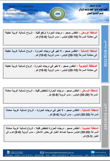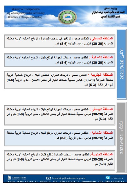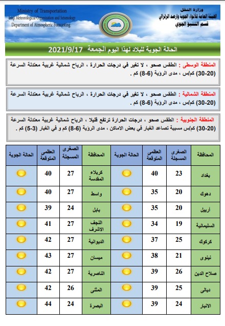 محلياتانخفاض جديد بدرجات الحرارة في العراق قبل 4 سنوات 4 مشاهدات شارك توقعت هيئة الانواء الجوية، انخفاض درجات الحرارة في العراق خلال الايام المقبلة. الوسومالطقسقد يهمك أيضا أمن الاستخبارات العسكرية تحبط عملية تهريب مشتقات نفطية وتلقي القبض على منفذها في نينوى قبل 20 دقيقة 3 مشاهدات سياسة القاضي زيدان: الدستور نص على انتخاب رئيس مجلس النواب ونائبيه في الجلسة الأولى وأي اجتهاد يعد مخالفة دستورية قبل 36 دقيقة 5 مشاهدات سياسة مجلس ذي قار يصوّت على اختيار هيثم عزيز محافظاً قبل 42 دقيقة 6 مشاهدات سياسة مجلس محافظة ذي قار يصوت بالموافقة على استقالة المحافظ مرتضى الإبراهيمي قبل ساعة واحدة 5 مشاهدات محليات التربية تصدر قراراً يخص الطلبة الراسبين في مدارس المتميزين وثانويات كلية بغداد قبل ساعة واحدة 11 مشاهدات