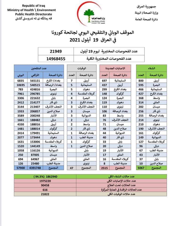 أعلنت وزارة الصحة، اليوم الاحد، الموقف الوبائي اليومي لجائحة كورونا في عموم العراق.