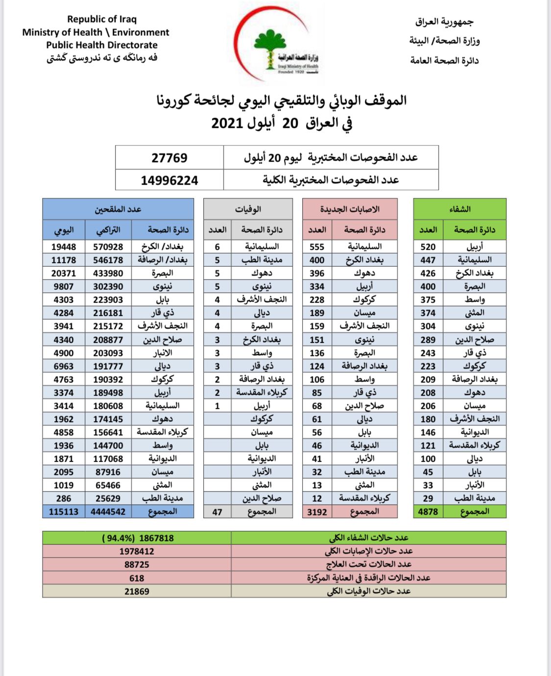 أعلنت وزارة الصحة، اليوم الاثنين، الموقف الوبائي اليومي لجائحة كورونا في عموم العراق.