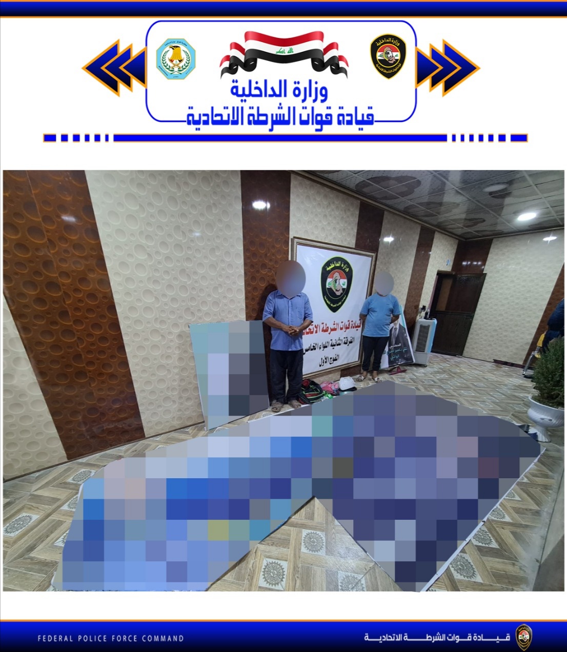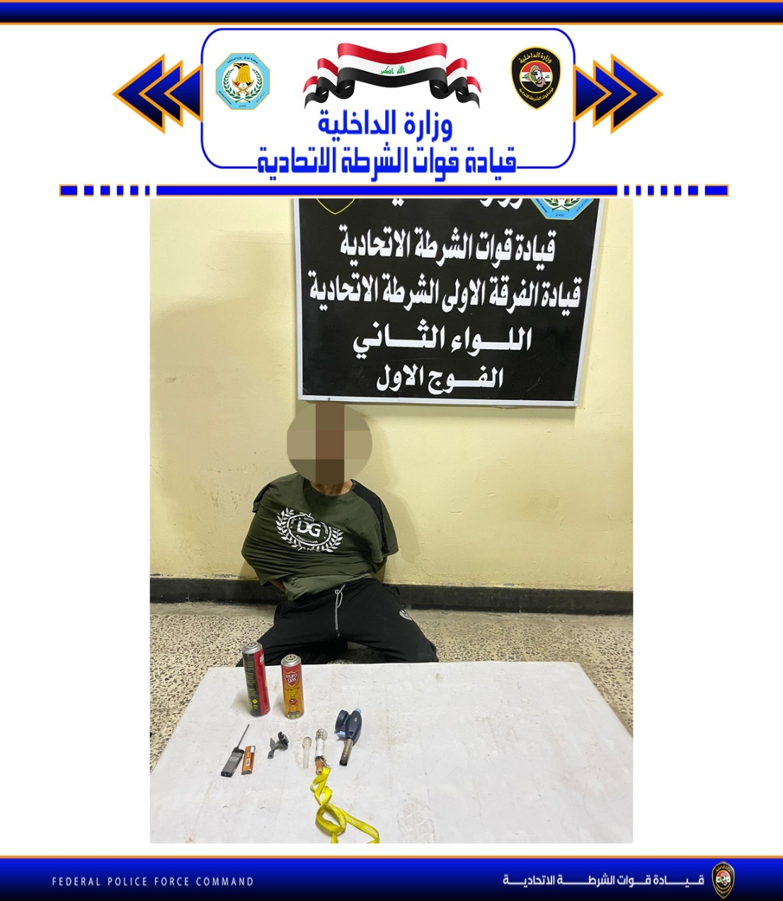 واضافت، كما “تمكنت قوة من اللواء الثاني الفرقة الأولى شرطة اتحادية بالاشتراك مع مفارز استخبارات الفوج الاول، من إلقاء القبض على متهم مطلوب وفق أحكام المادة ٢٨”مخدرات في منطقة (شهداء العبيدي) شرقي بغداد ضبط بحوزته قنينتي اشعال، بايبين زجاجي يستخدم للتعاطي، ميزان إلكتروني، قداحتين”.