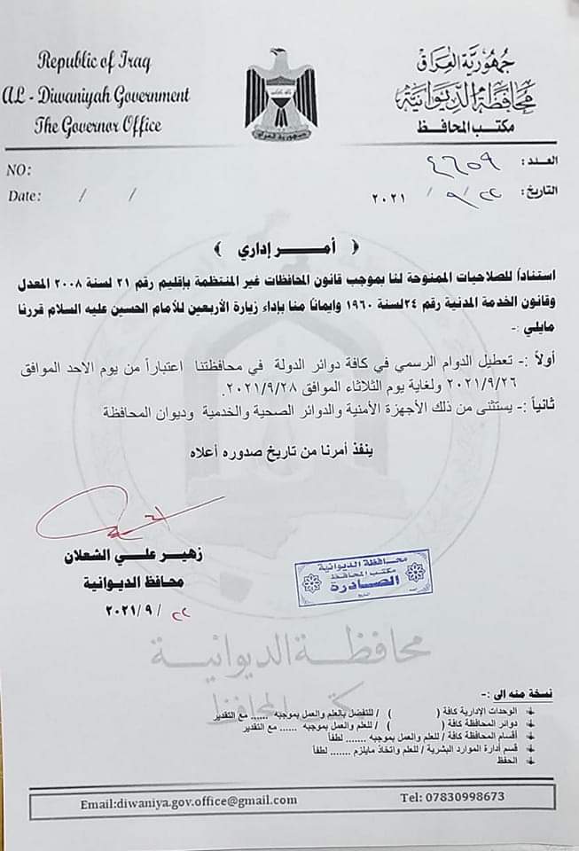 وذكرت محافظة الديوانية في بيان تلقته”الرشيد”، انه”تقرر تعطيل الدوام الرسمي من يوم الاحد الى الثلاثاء في الاسبوع المقبل”.