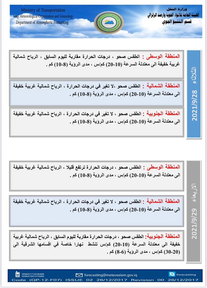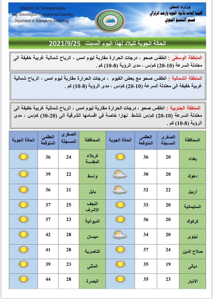 نشرت هيئة الانواء الجوية، السبت، توقعاتها للطقس في البلاد خلال الايام المقبلة، فيما اشارت الى ان درجات الحرارة تتارجح بين الارتفاع والانخفاض.