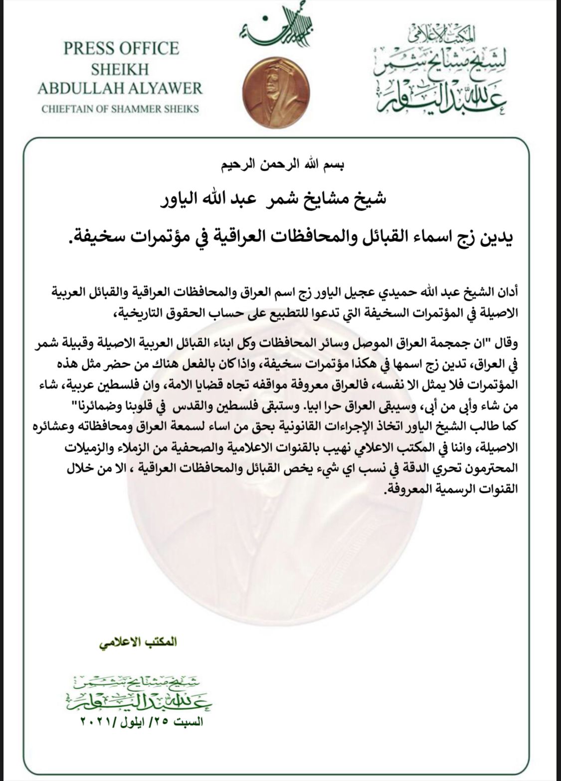 سياسةبالوثيقة .. شيخ مشايخ شمر يدين زج اسماء القبائل والمحافظات بمؤتمرات وصفها بالسخيفة قبل 4 سنوات 17 مشاهدات شارك الوسومشيخ مشايخ شمرقد يهمك أيضا عربي ودولي وكالة: ترامب يعارض ضم إسرائيل للضفة الغربية قبل 8 دقائق 4 مشاهدات سياسة النزاهة تضبط موظفاً في مديرية تربية نينوى متلبساً بالرشوة قبل 11 دقيقة 6 مشاهدات سياسة الحكومة تجدد التأكيد: الرواتب مؤمّنة وتُعدّ أولوية مقدسة قبل 19 دقيقة 8 مشاهدات أقتصاد تراجع أسعار الذهب قبيل صدور بيانات اقتصادية أميركية مهمة قبل 46 دقيقة 6 مشاهدات أقتصاد انخفاض في أسعار النفط بالأسواق العالمية قبل ساعة واحدة 6 مشاهدات
