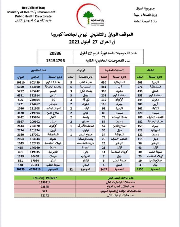 أعلنت وزارة الصحة، اليوم الاثنين، الموقف الوبائي اليومي لجائحة كورونا في عموم العراق.