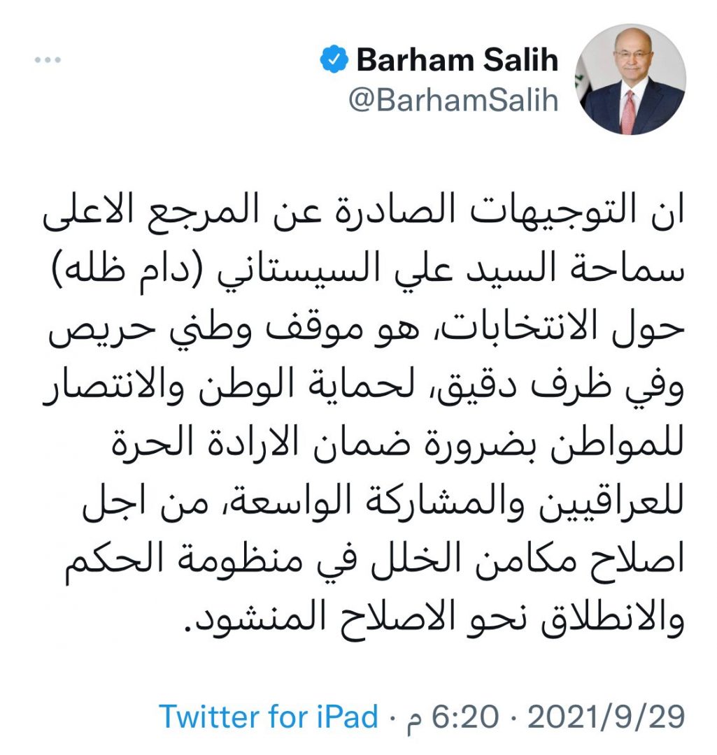 قراءة: الرئيس صالح: توجيهات السيد السيستاني حول الانتخابات موقف وطني لحماية الوطن والانتصار للمواطن