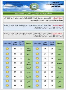 وذكرت الهيئة في تقرير تلقته"الرشيد"، أن "طقس يوم غد الجمعة سيكون صحواً، ولا تغير في درجات الحرارة، أما الرياح ستكون شمالية غربية خفيفة إلى معتدلة السرعة (10-20) کم/س في عموم البلاد".