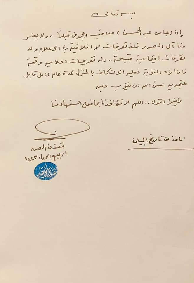 إن (عباس عبد الحسن) معاقب ومجمد من قبلنا .. ولا يعتبر منا آل الصدر فله تصرفات لا اخلاقية في الاعلام وله تصرفات اجتماعية قبيحة .. وله تصريحات اعلامية وقحة فان اراد التوبة فعليه الاعتكاف بالمنزل لمدة عام كامل قابل للتجديد عسىٰ الله ان يتوب عليه