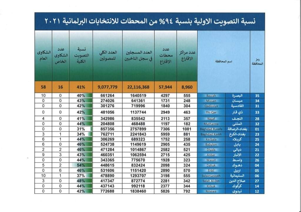 وذكرت المفوضية في بيان تلقته”الرشيد”، أن” نسبة التصويت الأولية في الاقتراع العام بلغت 41 بالمئة”.