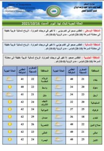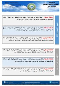 نشرت هيئة الانواء الجوية، توقعاتها لطقس العراق خلال الايام المقبلة، فيما اشارت الى انخفاض بدرجات الحرارة واحتمالية تساقط امطار.