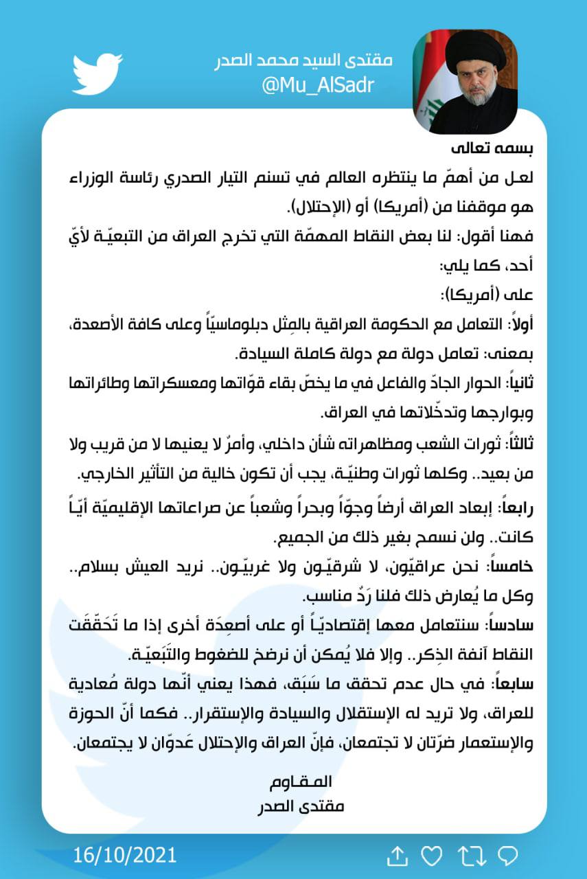 سياسةالصدر يطرح سبع نقاط لاخراج العراق من التبعية ويعلق بشأن منصب رئاسة الوزراء قبل 4 سنوات 4 مشاهدات شارك الوسومالصدرمنصب رئاسة الوزراءقد يهمك أيضا عربي ودولي قرار جديد من مجموعة السبع والاتحاد الأوروبي: فرض حظر كامل على النفط الروسي قبل 11 دقيقة 2 مشاهدات رياضة الفيفا يمنح جائزة السلام 2025 لدونالد ترامب قبل 50 دقيقة 7 مشاهدات أمن العراق يعلن إنشاء "بنك معلومات وطني" للأسلحة قبل ساعة واحدة 6 مشاهدات عربي ودولي قيود وضوابط جديدة.. اليابان تشدد سياسات الهجرة رغم شيخوخة السكان قبل ساعة واحدة 7 مشاهدات محليات العراق يستعد لاستقبال حالة جوية غير مستقرة وأمطار غزيرة اعتباراً من مساء الغد قبل ساعتين 5 مشاهدات