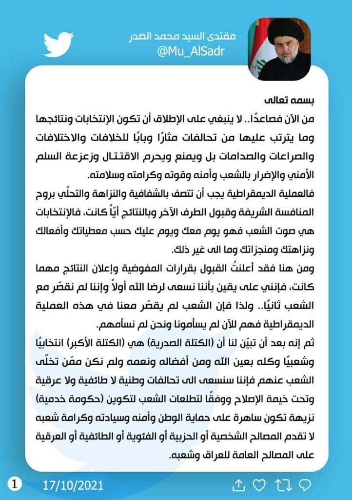 واضاف، “من هنا فقد أعلنتُ القبول بقرارات المفوضية وإعلان النتائج مهما كانت، فإنني على يقين بأننا نسعى لرضا الله أولاً وإننا لم نقصر مع الشعب ثانيًا.. ولذا فإن الشعب لم يقصّر معنا في هذه العملية الديمقراطية فهم للآن لم يسأمونا ونحن لم نسأمهم، ثم إنه بعد أن تبيّن لنا أن (الكتلة الصدرية) هي (الكتلة الأكبر) انتخابيًا وشعبيًا وكله بعين الله ومن أفضاله ونعمه ولم نكن ممّن تخلّى الشعب عنهم فإننا سنسعى الى تحالفات وطنية لا طائفية ولا عرقية وتحت خيمة الإصلاح ووفقًا لتطلعات الشعب التكوين (حكومة خدمية) نزيهة تكون ساهرة على حماية الوطن وأمنه وسيادته وكرامة شعبه لا تقدم المصالح الشخصية أو الحزبية أو الفئوية أو الطائفية أو العرقية على المصالح العامة للعراق وشعبه”.