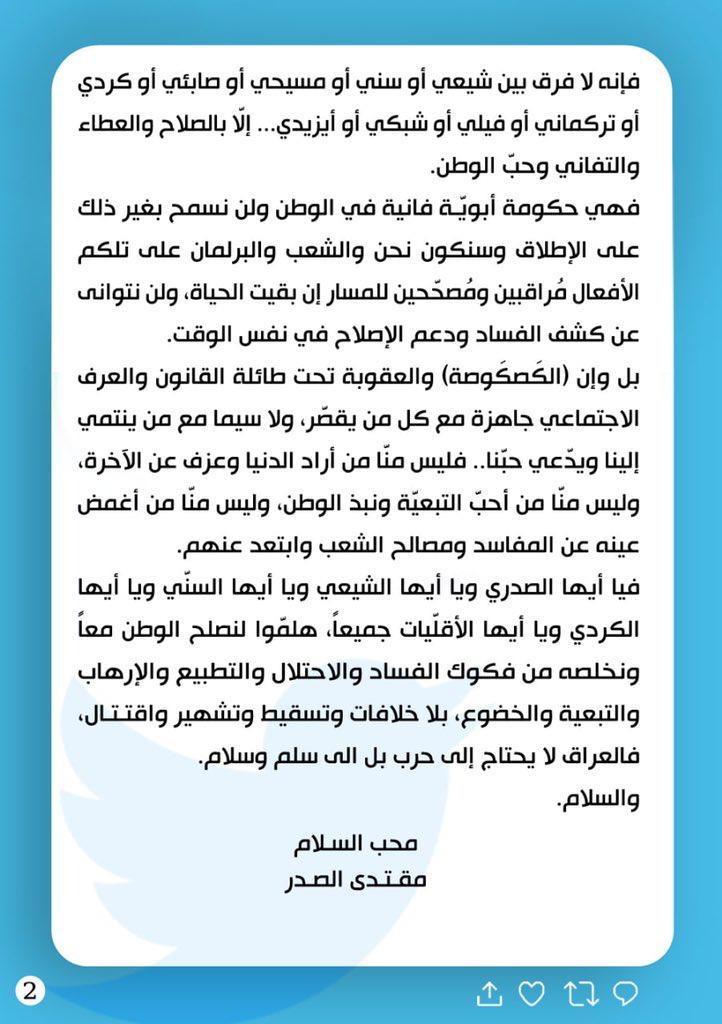 وختم بالقول: “فيا أيها الصدري ويا أيها الشيعي ويا أيها السنّي ويا أيها الكردي ويا أيها الأقلّيات جميعاً، هلمّوا لنصلح الوطن معاً ونخلصه من فكوك الفساد والاحتلال والتطبيع والإرهاب والتبعية والخضوع، بلا خلافات وتسقيط وتشهير واقتتال، فالعراق لا يحتاج إلى حرب بل الى سلم وسلام”.