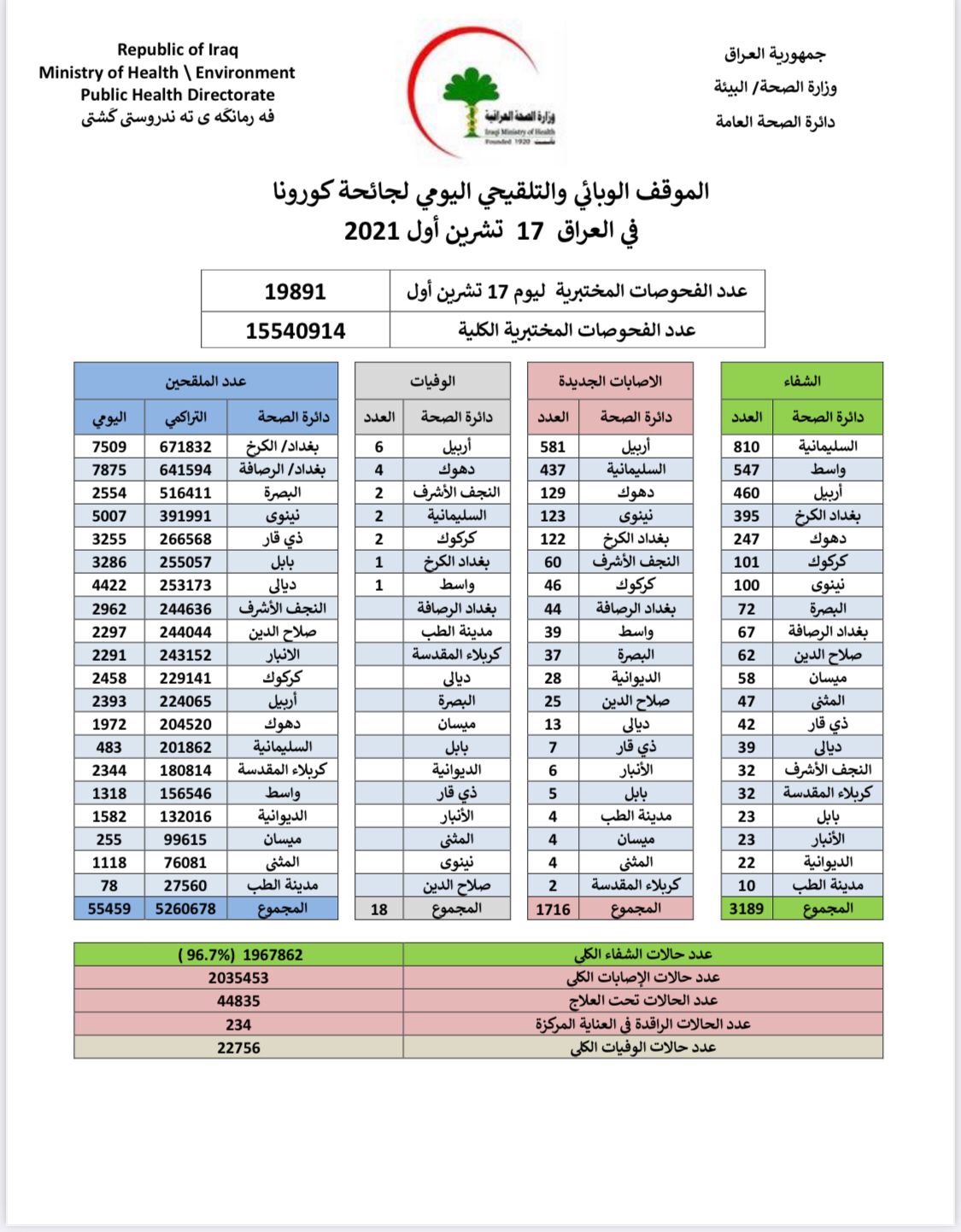 أعلنت وزارة الصحة، اليوم الاحد، الموقف الوبائي اليومي لجائحة كورونا في عموم العراق.