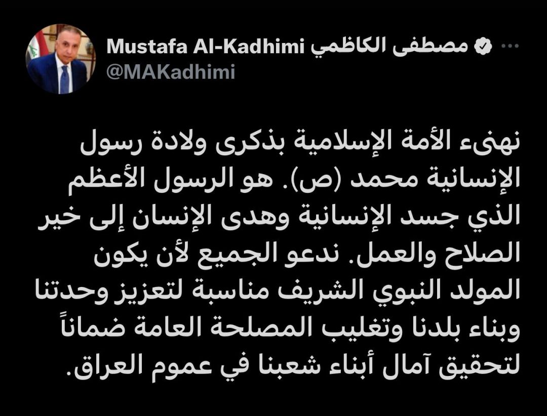 وقال الكاظمي، في تغريدة له على تويتر، تابعتها الرشيد، “نهنىء الأمة الإسلامية بذكرى ولادة رسول الإنسانية محمد (ص)، هو الرسول الأعظم الذي جسد الإنسانية وهدى الإنسان إلى خير الصلاح والعمل”.