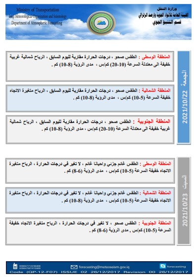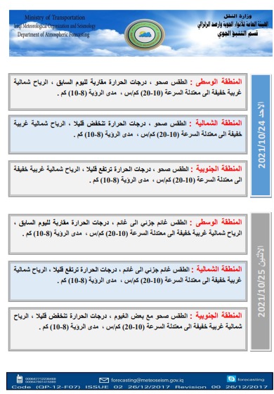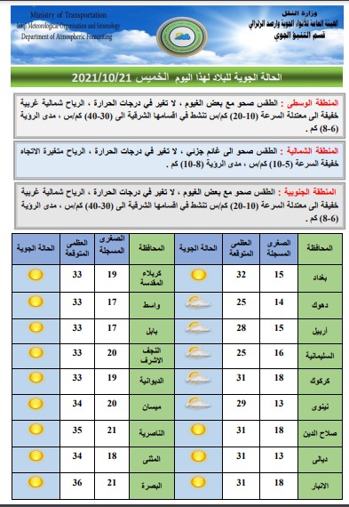 محلياتطقس العراق.. غيوم وحرارة متقلبة خلال الايام المقبلة قبل 4 سنوات 1 مشاهدة شارك اعلنت هيئة الانواء الجوية، الخميس، توقعاتها لطقس العراق خلال الايام المقبلة. الوسومالطقسقد يهمك أيضا عربي ودولي فرنسا تتجه لتشريع طارئ لتفادي الشلل بعد تعثر موازنة 2026 قبل 30 دقيقة 4 مشاهدات عربي ودولي 1.6 مليون فلسطيني يواجهون المجاعة في غزة ووفاة 1200 مريض بسبب الحصار قبل 56 دقيقة 6 مشاهدات عربي ودولي واشنطن: على الرئيس الفنزويلي نيكولاس مادورو "الرحيل" قبل ساعة واحدة 7 مشاهدات عربي ودولي بعد تقرير البنتاغون.. الصين ترد: لسنا في سباق تسلح نووي مع أحد قبل ساعتين 9 مشاهدات محليات إقليم كردستان يعطل الدوام الرسمي ليوم الخميس المقبل قبل ساعتين 13 مشاهدات