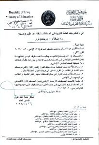 واضاف، انه”ينقل تلاميذ الصفوف الأربعة الأولى المنتظمين في الدوام الذين أدوا امتحانات نصف السنة من (الصف الأول الابتدائي الى الصف الرابع الابتدائي) ، الى صف أعلى من الصفوف التي داوموا فيها للعام الدراسي 2020 – 2021 “.