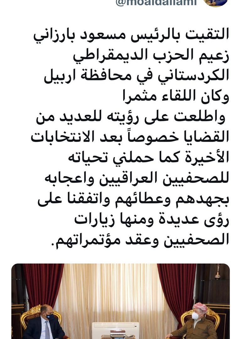 زقال اللامي في تغريدة عبر تويتر اطلعت عليها"الرشيد": "التقيت بالرئيس مسعود بارزاني زعيم الحزب الديمقراطي الكردستاني في محافظة اربيل وكان اللقاء مثمرا".