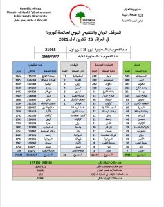 أعلنت وزارة الصحة، اليوم الاثنين، الموقف الوبائي اليومي لجائحة كورونا في عموم العراق.