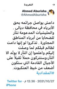 غرد رئيس صحوة العراق احمد ابو ريشة، بشأن جريمة المقدادية التي وقعت يوم امس.