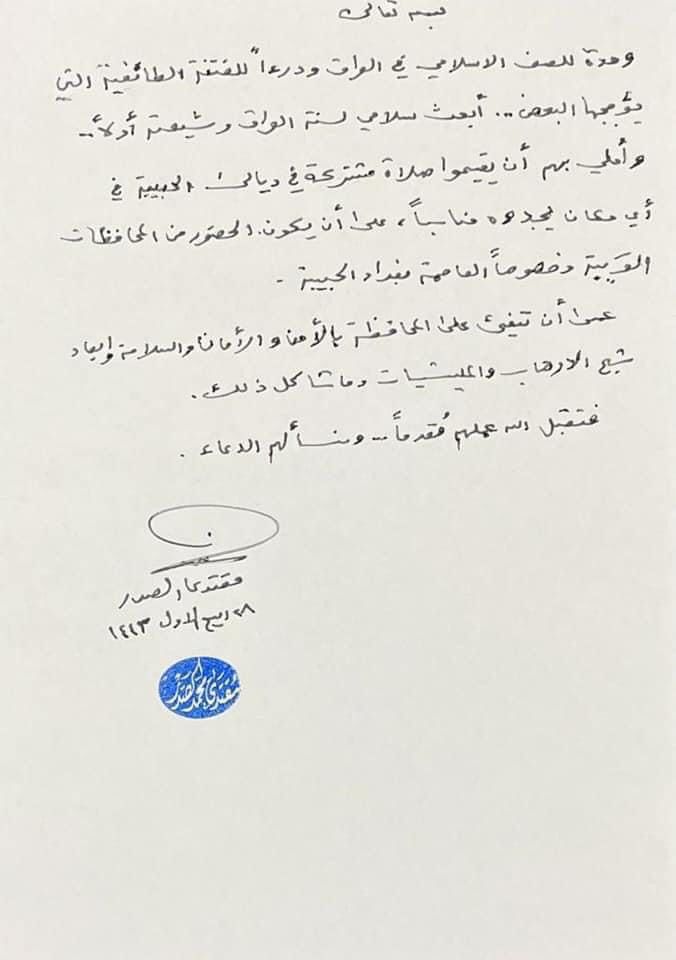 وقال الصدر، في كتاب بخطه الشخصي وحمل توقيعه، حصلت عليه الرشيد، “وحدة للصف الاسلامي في العراق ودرءاً للفتنة الطائفية التي يؤججها البعض، أبعث سلامي لسنة العراق وشيعته أولاً، وأملي بهم أن يقيموا صلاة مشتركة في ديالى الحبيبة في أي مكان يجدوه مناسباً، على أن يكون الحضور من المحافظات القريبة وخصوصاً العاصمة بغداد الحبيبة”.