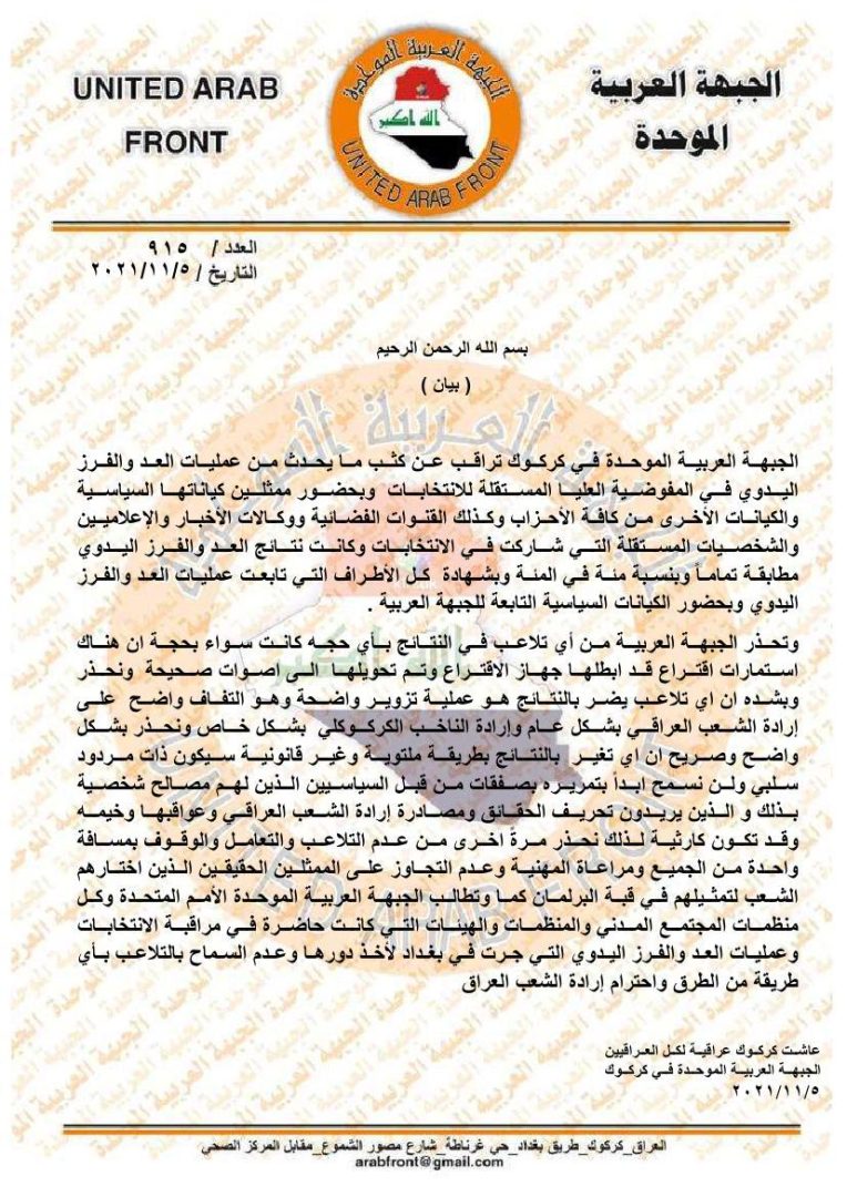 اصدرت الجبهة العربية الموحدة في كركوك، الجمعة، بيانا بشأن العد والفرز اليدوي للمحطات الانتخابية المطعون بها.