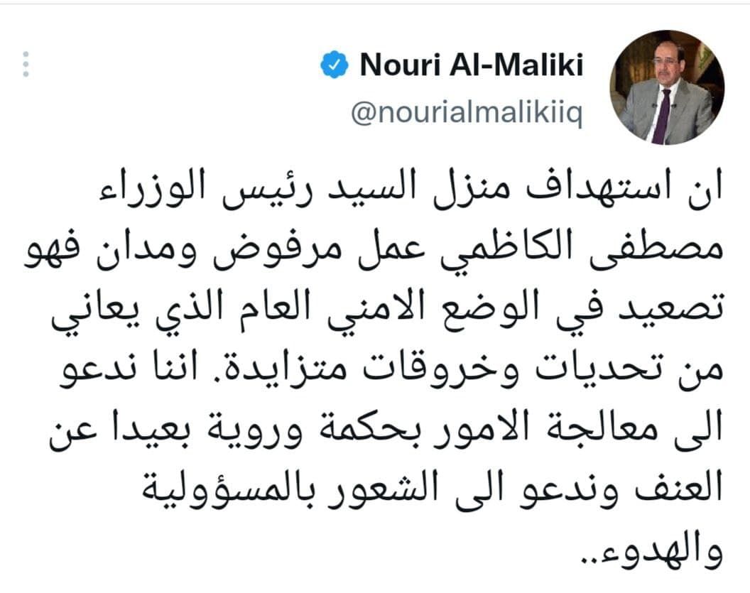 اعتبر رئيس ائتلاف دولة القانون نوري المالكي، استهداف منزل رئيس الوزراء مصطفى الكاظمي عمل مرفوض ومدان وتصعيد في الوضع الامني العام.