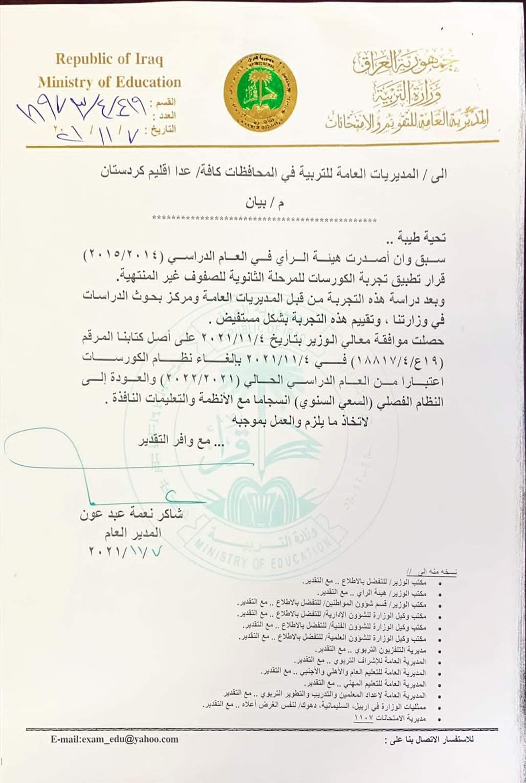 وذكر بيان للتربية تلقته”الرشيد”، ان”وزير التربية علي حميد الدليمي وجه المديرية العامة للتقويم والامتحانات بإلغاء العمل بنظام الكورسات والعودة الى النظام الفصلي (السعي السنوي) للمرحلة الثانوية للصفوف غير المنتهية اعتباراً من العام الدراسي 2021 – 2022″.