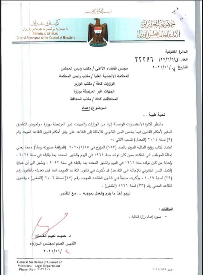 محلياتبالوثيقة .. الامانة العامة لمجلس الوزراء تبين السن القانوني للاحالة على التقاعد قبل 4 سنوات 13 مشاهدات شارك الامانة العامة لمجلس الوزراء الوسومقانون التقاعدقد يهمك أيضا محليات بينها ارتداء الملابس غير المخلة.. المرور تصدر توجيهات تنظم عمل أصحاب حافلات النقل الجماعي الداخلي قبل 17 دقيقة 3 مشاهدات محليات مصرع مواطن خمسيني نتيجة سقوط عجلته من أعلى جسر الشعلة ببغداد بسبب الضباب قبل 21 دقيقة 3 مشاهدات سياسة المفوضية تنشر المادة الخاصة بالمقاعد البرلمانية الشاغرة واستبدالها قبل 25 دقيقة 3 مشاهدات محليات الثقافة: منحة الصحفيين والفنانين والأدباء بانتظار إشعار الصرف من المالية قبل 35 دقيقة 6 مشاهدات محليات توقف الرحلات الجوية في مطار بغداد بشكل مؤقت بسبب الضباب قبل ساعة واحدة 9 مشاهدات