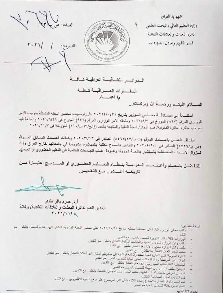 وذكرت الوزارة، في وثيقة ضمت إعماماً إلى الدوائر الثقافية العراقية والسفارات العراقية، حصلت عليها الرشيد، أنه “تقرر إيقاف العمل بالإعمام المرقم (ث ب/23/8463) الصادر في 13/ 7/ 2020 وكذلك الإعمام السابق المرقم (ص ب/6726) الصادر في 10/ 5/ 2020 والخاص بالسماح للطلبة بالمباشرة إلكترونياً في جامعاتهم خارج العراق وذلك لزوال الأسباب المتعلقة بانتشار جائحة كورونا وعودة أغلب الجامعات العالمية إلى التعليم الحضوري أو المدمج”.