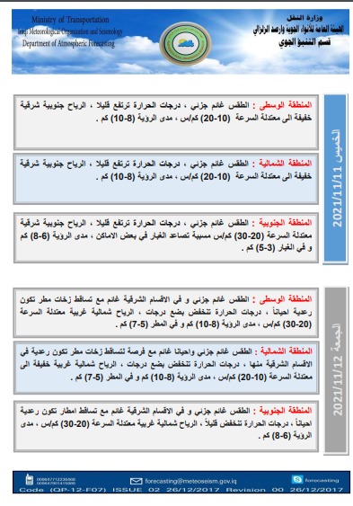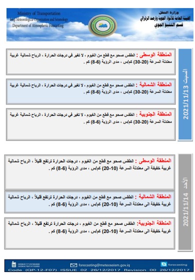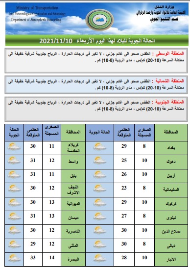 محلياتطقس العراق.. امطار رعدية وارتفاع بدرجات الحرارة خلال الايام المقبلة قبل 4 سنوات 2 مشاهدات شارك الطقساعلنت هيئة الانواء الجوية، الاربعاء، حالة طقس العراق خلال الايام المقبلة، فيما اشارت الى تساقط امطار وارتفاع بدرجات الحرارة. الوسومطقس العراققد يهمك أيضا محليات طقس العراق.. أمطار رعدية وانخفاض بدرجات الحرارة خلال الأيام المقبلة قبل 29 دقيقة 4 مشاهدات أقتصاد استقرار أسعار النفط وبرميل برنت فوق 63 دولاراً قبل 47 دقيقة 3 مشاهدات عربي ودولي الرئيس اللبناني: هدف المحادثات مع إسرائيل تجنب حرب ثانية قبل 10 ساعات 9 مشاهدات عربي ودولي مستشار المرشد الإيراني يهاجم بيان مجلس التعاون الخليجي بشأن الجزر الثلاث وحقل غاز "أرش" قبل 11 ساعة 11 مشاهدات سياسة قادة المجلس السياسي الوطني يتفقون على اعداد ورقة بشأن ادارة الدولة العراقية بالمرحلة المقبلة قبل 12 ساعة 9 مشاهدات