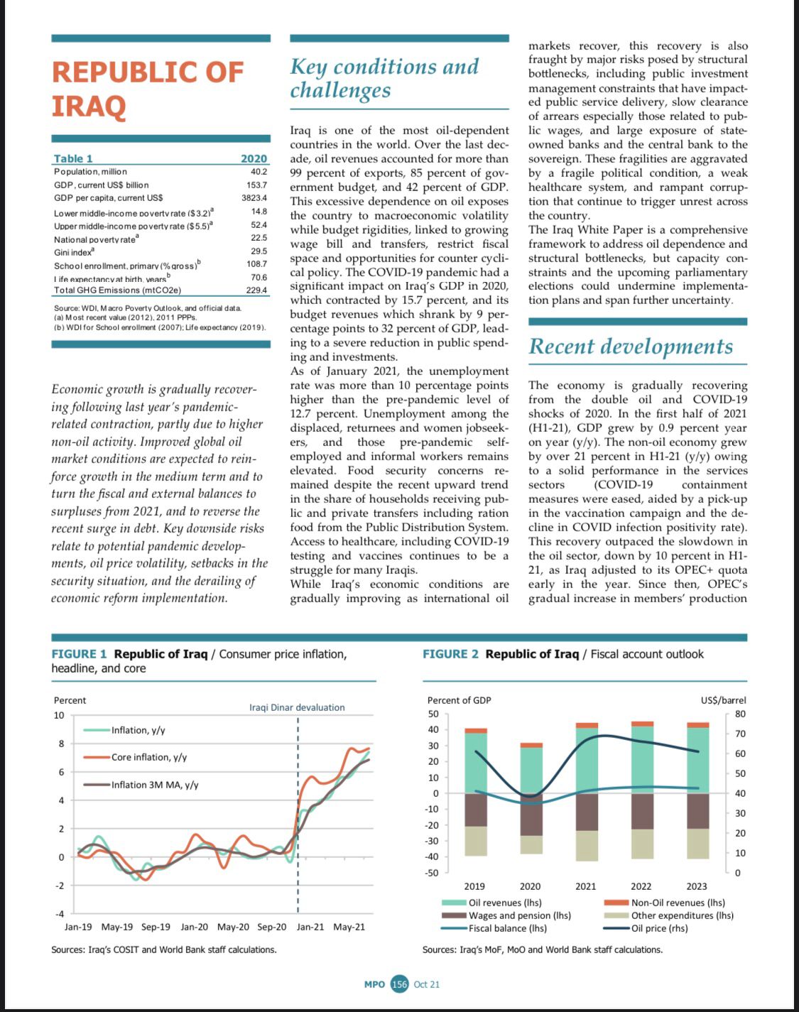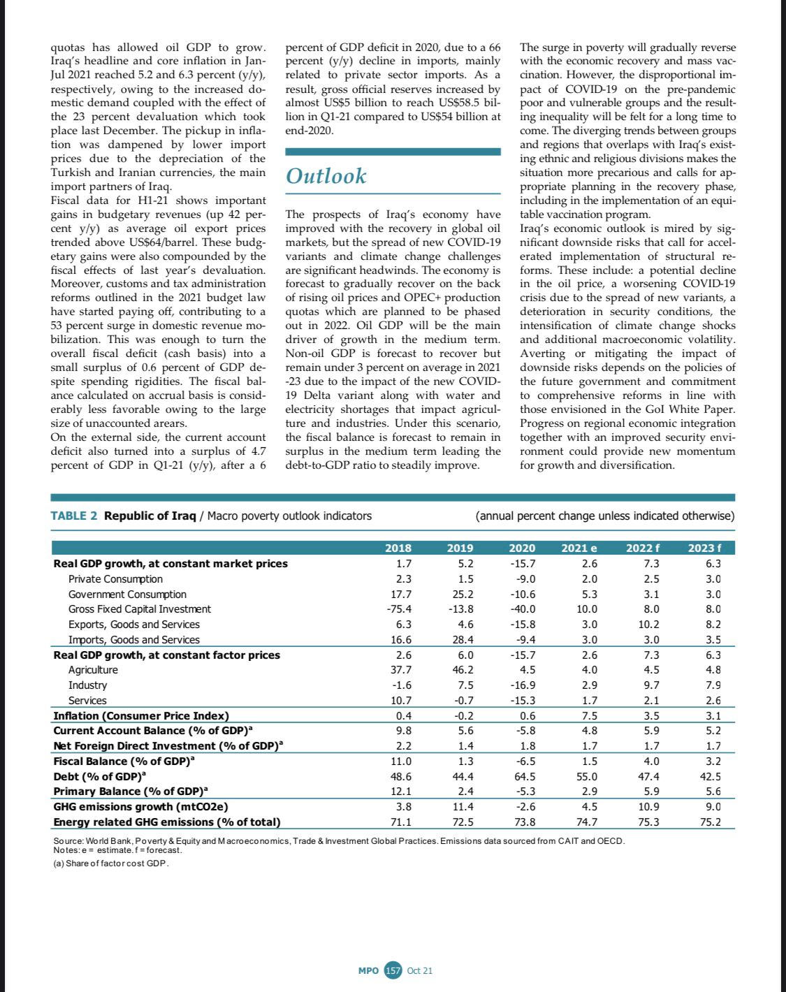 أفاد البنك الدولي ، في آخر تحديث اقتصادي له عن الاقتصاد العراقي، أن الناتج المحلي الإجمالي غير النفطي في النصف الأول من عام 2021 ارتفع بنسبة 21 +٪ مقارنة بالنصف الأول من عام 2020.