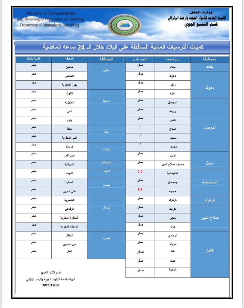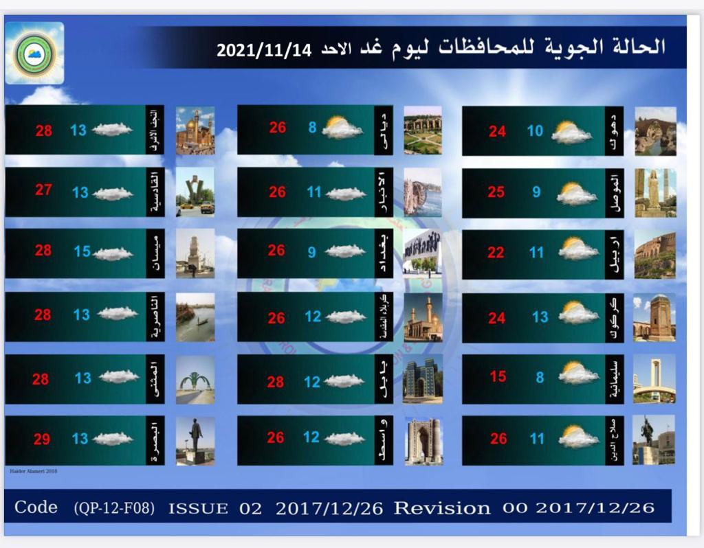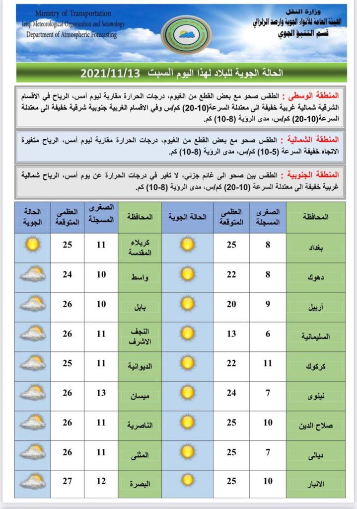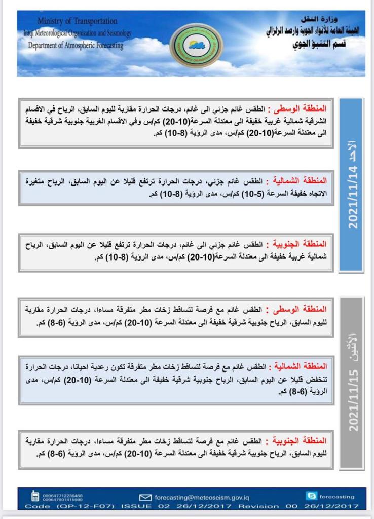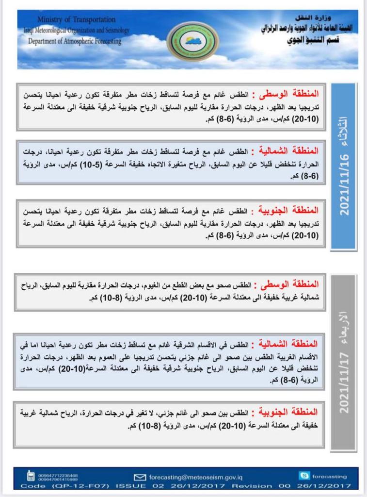 محلياتالامطار قادمة.. طقس غائم في العراق خلال الايام المقبلة قبل 4 سنوات 4 مشاهدات شارك الطقساعلنت هيئة الانواء الجوية، السبت، حالة طقس العراق خلال الايام المقبلة، فيما اشارت الى غيوم وامطار.اقرأ ايضا التجارة تطلق خدمة رفع الحجب إلكترونياً لذوي الاحتياجات الخاصة في عدد من المحافظات عودة الحركة الملاحية في مطار بغداد الدولي التجارة: سيتم تفكيك العجلات القديمة وغير المتوافقة مع شروط السلامة بينها ارتداء الملابس غير المخلة.. المرور تصدر توجيهات تنظم عمل أصحاب حافلات النقل الجماعي الداخلي الوسومامطارطقس العراققد يهمك أيضا محليات التجارة تطلق خدمة رفع الحجب إلكترونياً لذوي الاحتياجات الخاصة في عدد من المحافظات قبل 28 دقيقة 6 مشاهدات أمن الداخلية تنفي إحالة مشروع دمج البطاقة الوطنية مع بطاقة السكن إلى شركة سورية قبل 31 دقيقة 6 مشاهدات تقارير شركة أمواج الدولية تعقد اجتماع الهيئة العامة تمهيدًا لطرح أسهمها للاكتتاب العام في سوق العراق للأوراق المالية قبل ساعة واحدة 34 مشاهدات عربي ودولي الاتحاد الأوروبي يدرج 40 سفينة في حزمة عقوبات جديدة ضد روسيا قبل ساعة واحدة 6 مشاهدات أمن جنايات البصرة: الإعدام بحق تاجر مخدرات بحوزته 2 كغم من مادة الافيون قبل ساعتين 9 مشاهدات