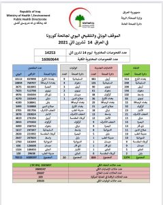 أعلنت وزارة الصحة، اليوم الاحد، الموقف الوبائي اليومي لجائحة كورونا في عموم العراق.
