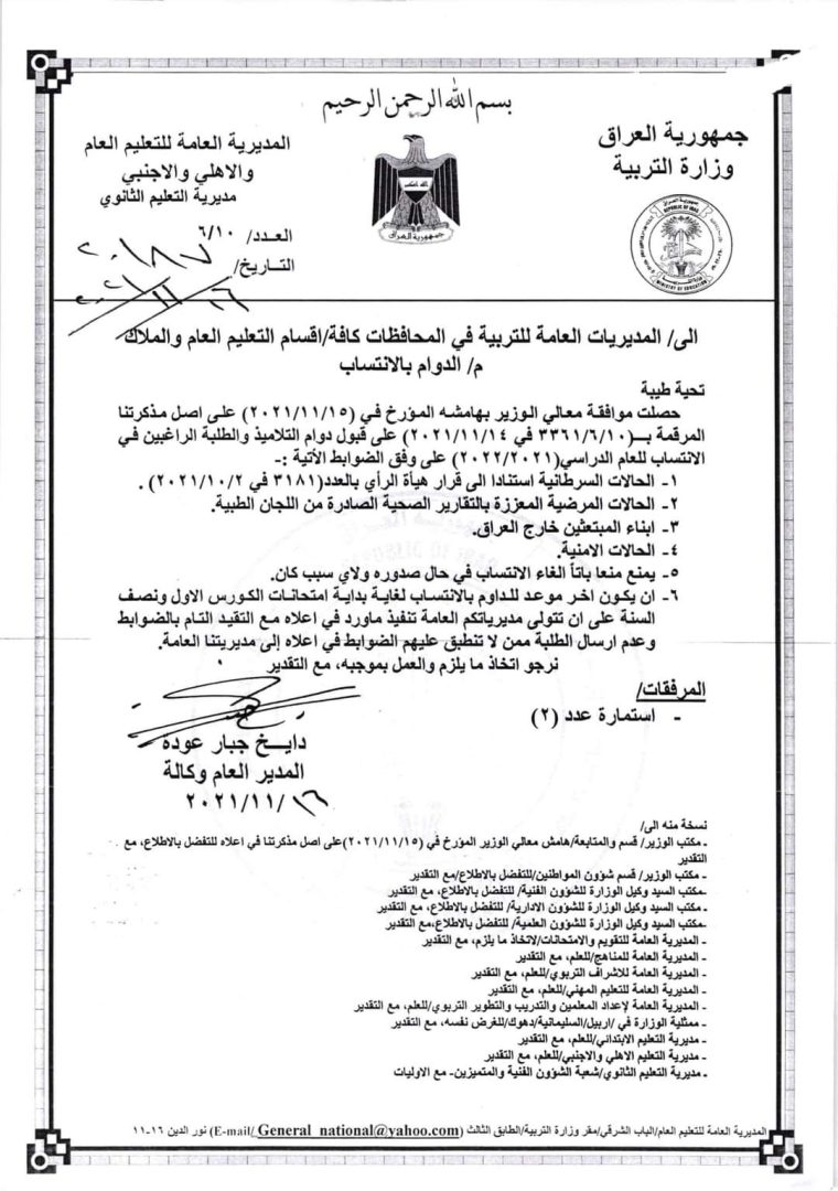 واشارت المديرية، الى “منع الغاء الانتساب في حالة صدوره ولأي سبب كان ، على ان يكون آخر موعد للدوام بالانتساب لغاية بداية امتحانات الكورس الاول ونصف السنة على ان تتولى المديريات العامة تنفيذ ما ورد في اعلاه ، مع التقييد التام بالضوابط وعدم ارسال الطلبة ممن لا تنطبق عليه تلك الضوابط الى مديريتنا العامة”.