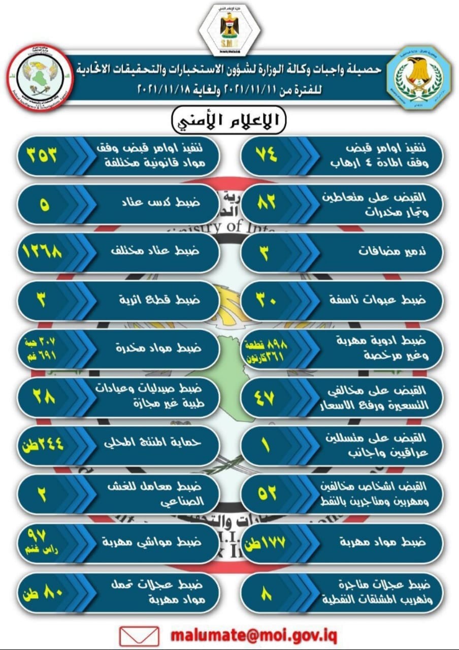 اعلنت وكالة الاستخبارات والتحقيقات الاتحادية، الجمعة، نشاطاتها خلال اسبوع.