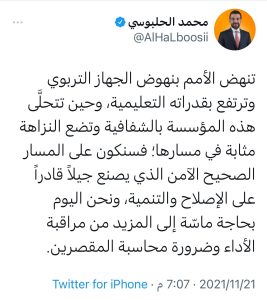 وقال الحلبوسي في تغريدة عبر تويتر اطلعت عليها”الرشيد”: “تنهض الأمم بنهوض الجهاز التربوي وترتفع بقدراته التعليمية، وحين تتحلَّى هذه المؤسسة بالشفافية وتضع النزاهة مثابة في مسارها؛ فسنكون على المسار الصحيح الآمن الذي يصنع جيلاً قادراً على الإصلاح والتنمية”.