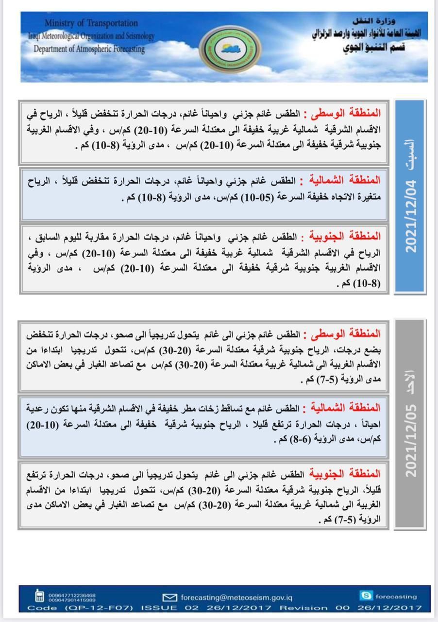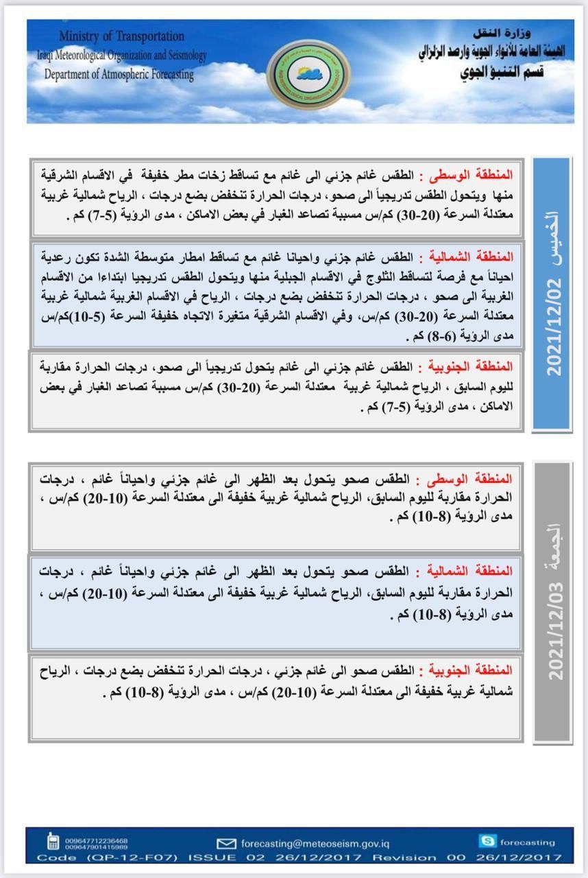 محلياتطقس العراق.. امطار رعدية وثلوج وانخفاض بدرجات الحرارة خلال الايام المقبلة قبل 4 سنوات 1 مشاهدة شارك الطقساعلنت هيئة الانواء الجوية، الاربعاء، حالة طقس العراق خلال الايام المقبلة، فيما اشارت الى هطول امطار وتساقط ثلوج.اقرأ ايضا طقس العراق.. أمطار رعدية وانخفاض بدرجات الحرارة خلال الأيام المقبلة المفوضية: الهيئة القضائية ردت أكثر من 800 طعن بنتائج الانتخابات حتى الآن الهيئة القضائية تحسم النظر بجميع الطعون المقدمة على نتائج الانتخابات وزير العدل يوجّه بإعفاء أحد المنفّذين العدول في بغداد لابتزازه إحدى المراجعات الوسومامطارثلوجطقس العراققد يهمك أيضا محليات طقس العراق.. أمطار رعدية وانخفاض بدرجات الحرارة خلال الأيام المقبلة قبل 40 دقيقة 5 مشاهدات أقتصاد استقرار أسعار النفط وبرميل برنت فوق 63 دولاراً قبل 58 دقيقة 4 مشاهدات عربي ودولي الرئيس اللبناني: هدف المحادثات مع إسرائيل تجنب حرب ثانية قبل 10 ساعات 9 مشاهدات عربي ودولي مستشار المرشد الإيراني يهاجم بيان مجلس التعاون الخليجي بشأن الجزر الثلاث وحقل غاز "أرش" قبل 11 ساعة 11 مشاهدات سياسة قادة المجلس السياسي الوطني يتفقون على اعداد ورقة بشأن ادارة الدولة العراقية بالمرحلة المقبلة قبل 12 ساعة 9 مشاهدات