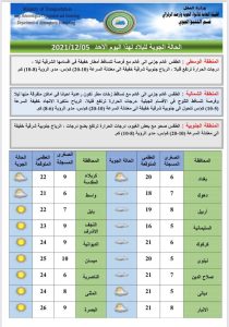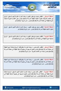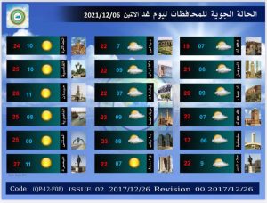 أعلنت هيئة الأنواء الجوية، االأحد، حالة الطقس في العراق للأيام القادمة، فيما توقعت تساقط أمطار مع ارتفاع في درجات الحرارة الأسبوع الحالي.