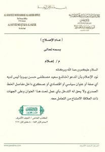 اعلن مكتب زعيم التيار الصدري السيد مقتدى الصدر، ان خاشع سعيد مصطفى بيرم ليس لديه اي عنوان داخل مفاصل التيار الصدري.