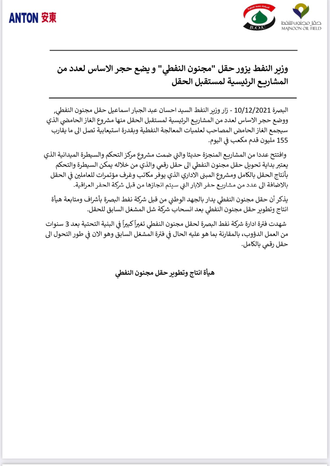 النفط: وضع حجر الاساس لمشروع الغاز الحمضي بقدرة 155 مليون قدم بحقل مجنون